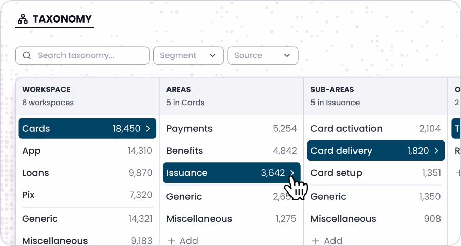 Mantenha total visibilidade e controle sobre como o feedback do cliente é estruturado. Revise, refine e desenvolva sua taxonomia à medida que novos sinais surgirem, para que os insights permaneçam alinhados com a realidade dos negócios.