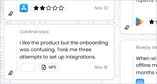 Obtenha sinais de pesquisas, conversas de suporte, avaliações e comunidades para entender o que os clientes estão dizendo em cada ponto de contato.