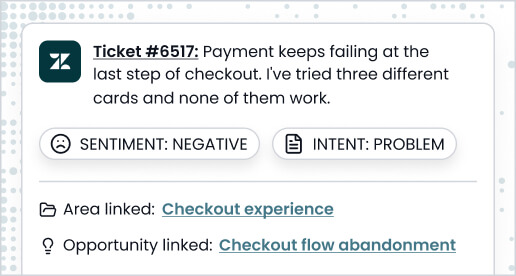 Direcione as oportunidades certas para CX, Produto, Suporte ou Operações para que as equipes mais próximas ao problema possam agir mais rapidamente, com maior precisão e com responsabilidade clara.