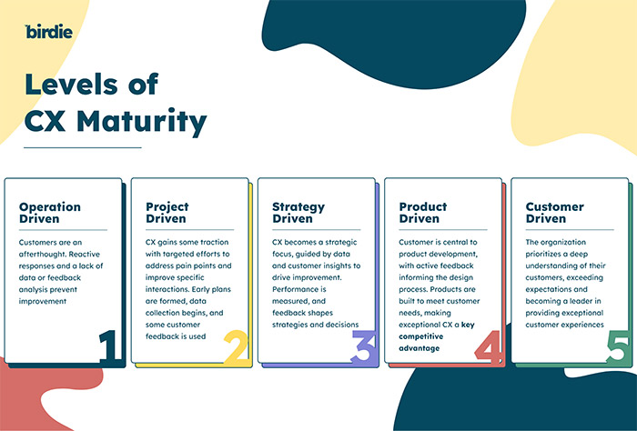 This model is also helpful to assess how your CX organization compares to other companies and to identify areas of focus to progress to the next level of maturity.